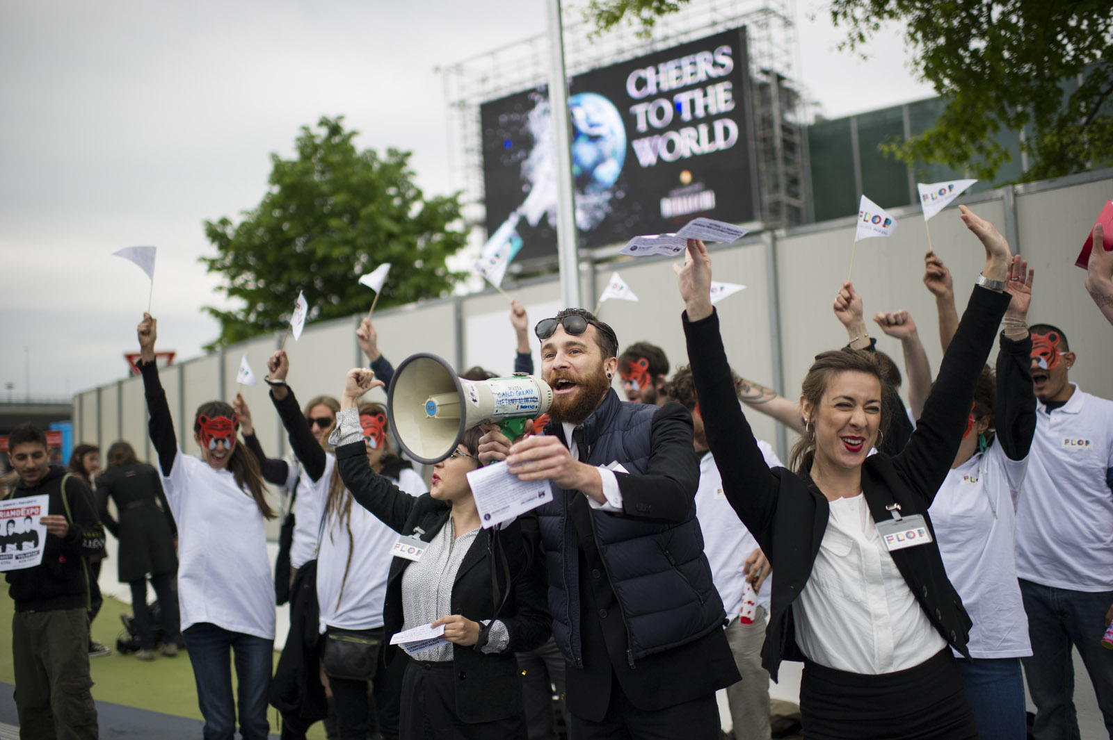 Tra stelle filanti, coriandoli, bandierine numerosi volontari hanno inscenato una finta inaugurazione rivendicando il diritto al reddito contro il lavoro non retribuito e sottopagato. Expo 2015 è infatti un laboratorio di sfruttamento dove su larga scala verrà per la prima volta sperimentato il lavoro gratuito di oltre 10mila volontari, che saranno la spina dorsale dell’esposizione alla faccia dei 70mila posti di lavoro promessi.