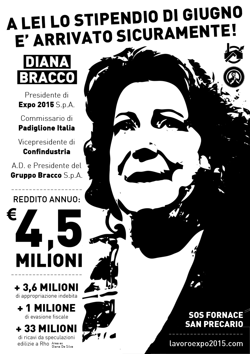 La storia del mancato versamento della mensilità di giugno ci è stata raccontata dai lavoratori; ora la si puà leggere su tutti i giornali: a giugno la gestione di Padiglione Italia è stata girata da JEC (J Events & Communication), capofila del raggruppamento temporaneo d’imprese vincitore dell’appalto, a The Kay, con Expo che ha contestato questa sorta di subappalto aprendo un contenzioso con la società. Da quel momento JEC – nata da un ramo d’azienda della Jumbo Grandi Eventi di Torino, coinvolta in un’inchiesta per turbativa d’asta con tanto di arresti tra i propri dirigenti – fa perdere le proprie tracce. The Kay, società costituitasi col capitale sociale minimo appena qualche giorno prima dell’ingresso in Expo, invece ha pensato di non pagare gli stipendi dicendo di esser in attesa dei soldi di Expo. Ovviamente, a fare le spese di questa girandola di sigle sono i lavoratori di Padiglione Italia. Sulla questione non sono al momento intervenuti né il commissario dotato di superpoteri Giuseppe Sala (che immaginiamo abbia ricevuto anche questo mese i suoi 35000 € di stipendio) né Diana Bracco, che somma le cariche di commissario di Padiglione Italia, Presidente di Expo Spa e vicepresidente di Confindustria, che pure questo mese ha visto approvare un’operazione immobiliare sul territorio di Rho con lauti ricavi alla faccia delle recenti accuse di evasione fiscale e appropriazione indebita.